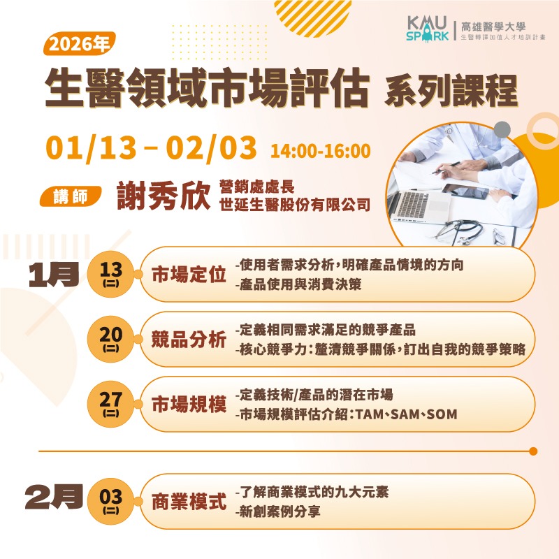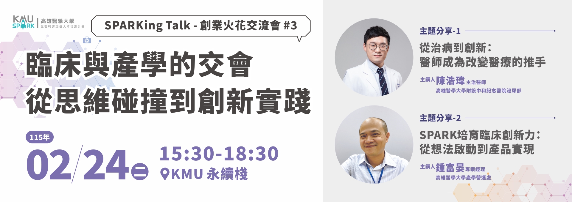 - 校址:高雄市三民區十全一路100號 (第一教學大樓12樓 KMU SPARK Office)