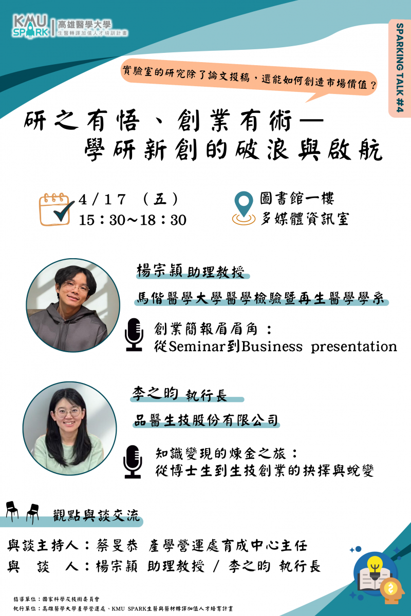 「SPARKing」代表點燃、延續與傳承火花,由高雄醫學大學產學營運處發起 《SPARKing Talk 創業火花交流會》,以「從學界走向創業」為主題,邀請曾親身參與生醫創業的學者與創業家,分享他們如何將研究成果轉化為實際產品與事業,並在創新道路上勇敢突破!